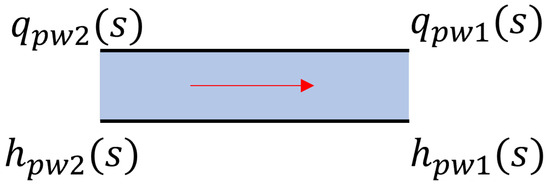 Figure 2 represents any pipe section in the s-domain for a pressurized pipeline. The pressure and flow rate at the left end (inlet end l = 1) of the pipe section are denoted as and , respectively. The pressure and flow rate at the right end (outlet end l = 0) of the pipe section are denoted as and , respectively. For this model with two cross-sections, each having two parameters, the relationship between the input and output can be described using a two-port network form.