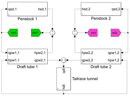 A physical schematic of the shared tailrace tunnel is shown in Figure 5. The water pressure at the downstream reservoir and the flow rate at the inlet of the tailrace tunnel are chosen as the system inputs. The water pressure at the inlet of the tailrace tunnel and the flow rate at the inlet of the downstream reservoir are the outputs. The boundary conditions for the tailrace tunnel are