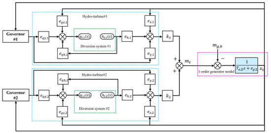 where represents the relative deviation of the torque; represents the relative deviation of the guide vane opening; represents the relative deviation of the turbine speed; , , and are the transfer coefficients of turbine torque with respect to the guide vane opening, speed, and head, respectively. , , and are the transfer coefficients of turbine flow rate with respect to the guide vane opening, speed, and head, respectively.