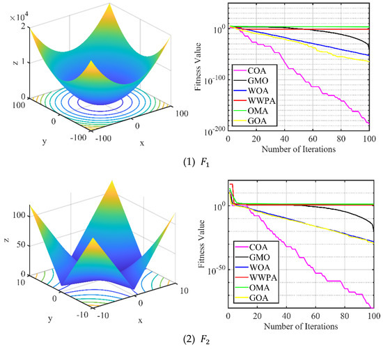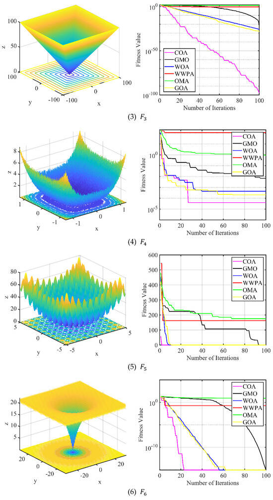 Three-dimensional surface of the test function and fitness variation curves of the different algorithms.