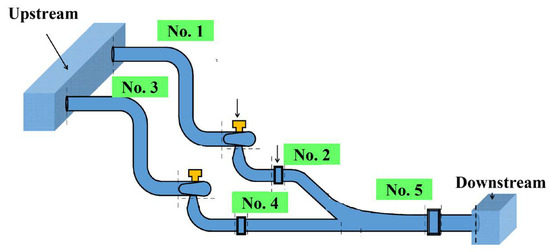 This section focuses on the simulation study. The pipeline numbering of the unit is shown in Figure 15, with the corresponding hydraulic parameters listed in Table 2. Additionally, the simulation parameters for the unit’s control system are provided in Table 3. Based on these simulation parameters and incorporating the aforementioned HURS model, a corresponding simulation model was constructed in the MATLAB/Simulink 2021a platform. The effectiveness and superiority of the proposed strategy were demonstrated through simulation and analysis under four different operating conditions for the HURS.