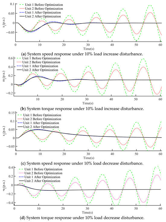 Under the FM, at t = 1 s during the simulation, a 10% load increase and decrease were introduced at the system load end, and the simulation curves are shown in Figure 16 As seen in Figure 16, during the changes in unit speed and torque, the PID parameters tuned by the COA still exhibited the best oscillation suppression effect under a 10% load disturbance. By t = 30 s, the PID parameters tuned by the COA had completely eliminated the speed and torque oscillations of the system. Moreover, the PID parameters tuned by this algorithm maintained minimal unit speed deviation and the smallest overshoot under various load disturbance conditions, demonstrating excellent dynamic response and stability performance.
