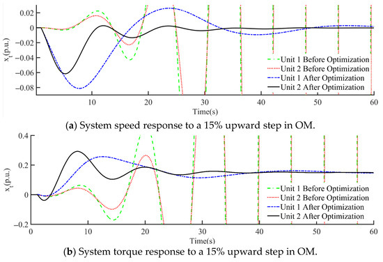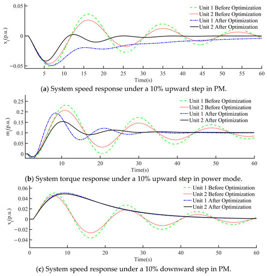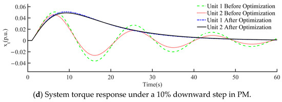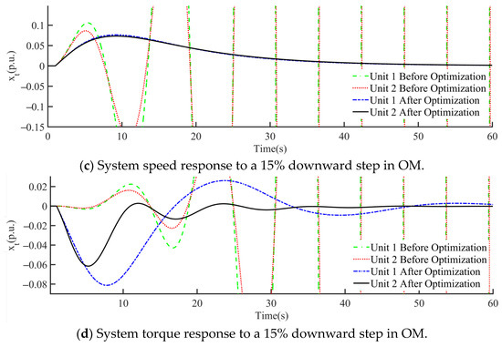 During the simulation, a 15% upward step and a 15% downward step in gate opening were implemented, and the corresponding speed and torque responses of the unit are shown in Figure 18. As observed from Figure 18, the optimized controller exhibited significant improvements in both tests. The rise time and regulation time were faster, enhancing the system’s response speed. The overshoot and settling time were precisely controlled within the ideal range, improving the system stability. Additionally, the pre-optimization system experienced low-frequency oscillations due to excessive overshoot, which was detrimental to stable system operation. The optimized controller parameters not only effectively reduced the overshoot and settling time but also eliminated low-frequency oscillations, greatly enhancing the system stability and dynamic response performance.