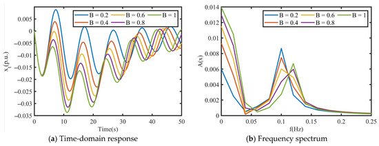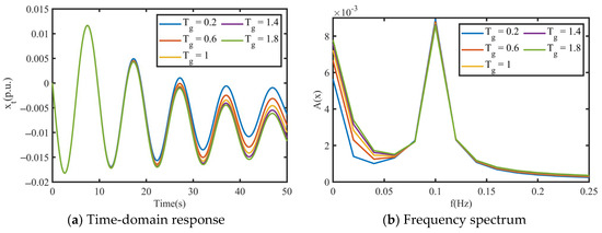 According to the simulation results shown in Figure 19, it is evident that had a significant impact on the stability and transient characteristics of the coupled system. Regarding the transient characteristics in the time domain, as shown in Figure 19a,b, with an increase in , the frequency of the low-frequency component in ’s time-domain transient response slightly increased, while the frequency of the high-frequency component slightly decreased. Additionally, the decay rate of the low-frequency component significantly decreased, leading to deteriorated stability. However, an increase in enhanced the damping of high-frequency oscillations, which helped them to decay quickly and stabilize the system. Furthermore, the analysis revealed that the equivalent grid characteristic parameter not only affected the low-frequency components of the time-domain transient response induced by the grid itself, but also had a coupling effect on the high-frequency components caused by the inherent oscillations of the speed control system. This also indicates that power systems with a high proportion of hydropower are prone to low-frequency oscillations.
