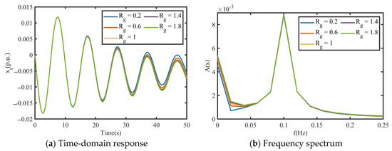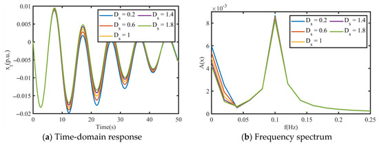 From the simulation results shown in Figure 21, it can be seen that had a certain impact on the system’s time-domain transient characteristics. As shown in Figure 21a,b, with an increase in , the decay rate of the low-frequency components in the time-domain transient response increased. However, an increase in had no significant effect on the decay rate of the high-frequency components. Therefore, a larger on the grid side can enhance a system’s stability, achieving a rapid decay in transient response oscillations. However, with the increasing integration of wind and solar power into the grid, which may reduce , due to the presence of power electronic devices, this exacerbates the risk of unit oscillations.