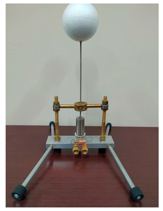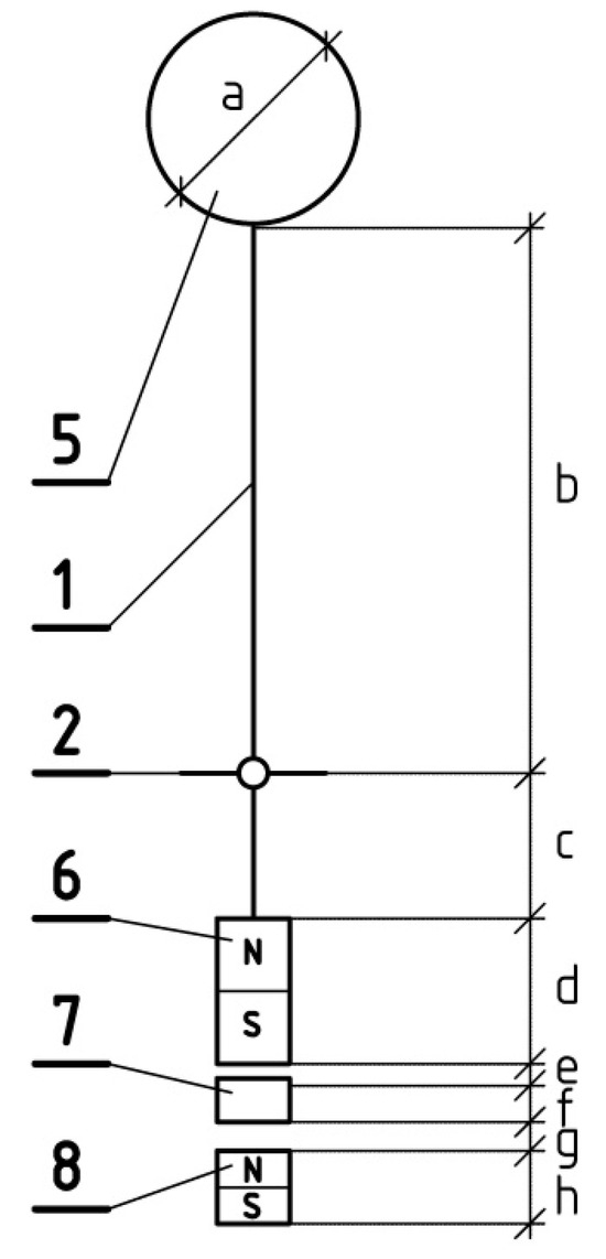 The pendulum arm is made in the form of a threaded rod with a diameter of 3 mm. The rod is mounted in a joint that enables pendulum movement in all directions of the horizontal plane. To minimize friction, the joint is made in the form of a set of two pairs of miniature 10 × 3 mm ball bearings with perpendicular, horizontal brass axes. The rod is attached to one of the axles, and the other axle is mounted on vertical brass side brackets. In order to enable changes in the geometric parameters of the harvester during the tests, these brackets are threaded and allow for changing the height of the joint mounting. It is also possible to change the height of the threaded rod mounting in the joint. The brackets are connected to the aluminum base of the device. Styrofoam balls are used as the aerodynamic element. Three balls with diameters of 67, 57, and 47 mm and masses of 4.96, 3.64, and 2.33 g were prepared for the tests. The balls have a glued threaded bed, enabling them to be mounted on the upper end of the rod. Neodymium ring magnets were used as permanent magnets in the harvester prototype. The outer diameter of the magnets is 19.5 mm, and the height is 2.6 mm. The magnets have a central hole with a diameter of 4 mm. The mass of a single magnet is 5 g. The magnetic induction in the geometric center of the magnetic pole surface is about 0.27 T. A set of 15 such magnets connected in the shape of a cylinder was mounted at the bottom of the pendulum rod. A ready-made coil from commercial relay was used in the presented prototype. An induction coil with an outer diameter of 20 mm and an inner diameter of 8 mm was placed under the magnets. The height of the coil is 15 mm. The coil was attached to an aluminum base. The coil contains 10 k turns of copper wire with a cross-section of about 0.003 mm2 and its resistance is 7.58 kΩ. The ends of the coil winding were connected to terminal connectors, enabling the connection of a load and voltage measurement. Under the coil, on the lower side of the base, there is a plastic screw, enabling the attachment of the lower magnets. The tests used a configuration of 3, 6, and 9 magnets placed under the coil, or no magnets. The schematic representation shown in Figure 3 shows the dimensions of the harvester used in the prototype in the series of measurements carried out, marked with symbols.