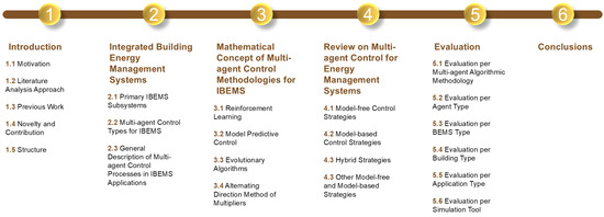 This paper is structured as follows: Section 1 integrates the motivation of the current review as well as the Literature Analysis Approach, the contribution and novelty, as well as the paper structure. Section 2 illustrates a general description of IBEMS frameworks, the classification of multi-agent types considering the interaction between the agents, as well as a description of the generalized process of model-based and model-free multi-agent control strategies for IBEMS. In Section 3, the general mathematical concept of the primary control strategies and algorithmic methodologies are given in detail. Next, in Section 4, a review of the most highly cited research works between 2014 and 2024 is illustrated per control strategy along with summarized tables integrating the primary characteristics of the research works. Section 5 concerns the evaluation of the different research aspects, integrating comparisons between the prevailing methodologies, the agent interactions, the IBEMS elements, the application types, and the simulation tools that have been primarily utilized. Last but not least, the Conclusions Section 6 summarizes the most significant outcomes of this work. Figure 1 illustrates graphically the structure of this paper.