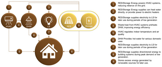 Managing energy at the building level through IBEMS involves coordinating various subsystems like HVAC, DHW, LSs, RES, ESS, and EVs. These subsystems are integrated to optimize energy use, comfort, and sustainability [7,30,42].