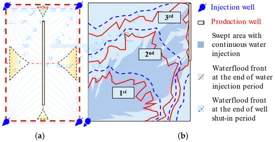 Cyclic water injection offers an enhanced displacement effect by alternating between periods of high-intensity injection and shut-in well percolation [,]. Figure 2a depicts a mixed five-point well unit with four straight wells and a horizontal well. Conventional continuous injection creates areas between injection wells where residual oil is difficult to recover, such as the yellow portion of Figure 2a. Figure 2b represents 1/4 of the unit. The background figure illustrates the water-driven ripple area during conventional continuous injection. The red solid line indicates the displacement front for each of the three cycles, and the blue dashed line marks the change in displacement front during the shut-in periods in the current cycles. Compared to conventional continuous water injection, cyclic water injection can delay the onset of water breakthrough and increase the waterflood-swept volume. This water injection method avoids the occurrence of a single dominant channel and ultimately improves the displacement efficiency of the reservoir.