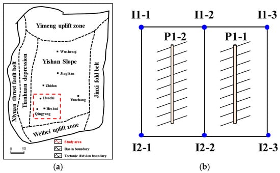 Block Z of the Heshui area is located in the southwestern part of the Ordos Basin, NW China, and the main reservoir is Chang6 member of the Triassic Yanchang Formation (Figure 3a). The study area develops natural fractures with a NE 70° direction. The maximum principal stress is NEE-SWW []. The main cause of WIFs in this area is that the water injection pressure is higher than the fracture opening pressure for a long time. Referring to the Chang 6 rupture pressure gradient of 0.022~0.023 MPa/m in other oil fields, the fracture pressure in this area is calculated to be at 35.2 MPa. The theoretical fracture pressure calculated from Equation (2) is 37 MPa. By injecting water for a long time at close to the fracture pressure, the induced fracture of a small area may be formed around the compression fracture.