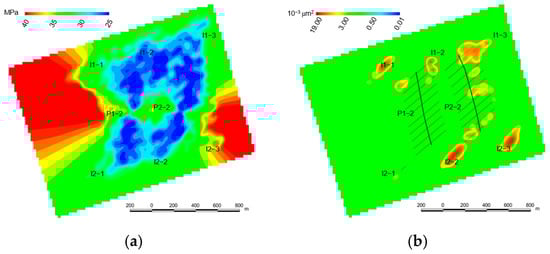 The development of waterflood-induced fractures was then assessed. Figure 4a presents the field map of threshold pressure. The figures indicate that lower pressure levels are needed to form WIFs along the flow lines of the injection and production wells. Notably, the pressure required in the region between the two fractured horizontal wells is slightly higher than in the heel and toe sections of the horizontal wells. This is attributed to the fluid’s preferential flow along the hydraulic fracture, leading to limited fluid washout in this area. Consequently, the threshold pressure is higher here than in other fractured areas but lower than in less fractured areas. Using Equation (4), we obtained the distribution of high-permeability channels at this stage (Figure 4b). These high-permeability strips exhibit directionality consistent with the maximum principal stress and the orientation of hydraulic fractures.