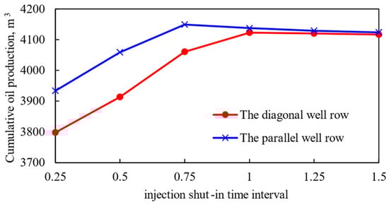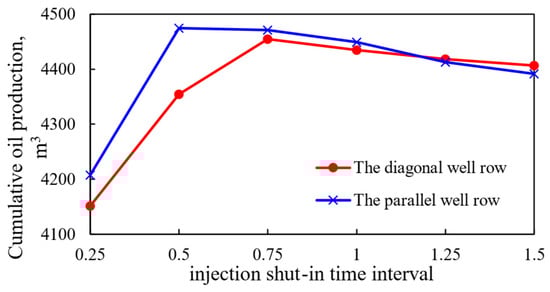 The injection duration (Di) was fixed, while only the production duration (Dp) was varied to explore the effect of different ratios of injection–production duration (ripd) on the performance of enhanced oil recovery. The cumulative oil production was simulated for six ripd values (0.25, 0.5, 0.75, 1, 1.25, 1.5). Meanwhile, the injection/production ratio was maintained at 1:1, and the total injection volume remained constant. In these scenarios, we simulated 20 cycles. The cumulative oil production for the different cases is shown in Figure 5. With the increase in the injection time interval, the cumulative oil production first increased and then decreased.