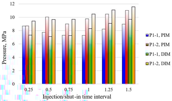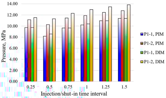 The present scheme also demonstrates superior performance in terms of pressure maintenance. As illustrated in Figure 9, there is an increase in bottomhole pressure of approximately 2 MPa per well, indicating more effective pressure maintenance. The pressure at P1-1 is essentially the same for both injection modes. However, the DIM simulation results in a slightly higher bottomhole pressure for P1-2 compared to PIM, aligning with previous simulation findings. Notably, the optimal ripd for DIM is 0.5, whereas for PIM it is 0.75. The AIPC for half-production-injection well shortens the length of individual cycles, achieving a higher recovery degree within a shorter simulation duration.