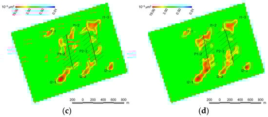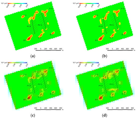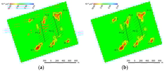 Figure 10 shows a field map of the high permeability region at five cycle intervals with PIM. In contrast to Figure 7, the morphology of the high permeability zones with the half-production–injection well method between the fractured joints of the production wells is more diffuse and does not communicate directly with the injection wells. This avoids directional seepage of injected water and controls the water content of the production wells.