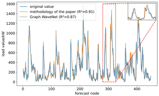 The Graph WaveNet model, which has the best prediction performance among the comparison models, is selected for further comparison with this study’s model, and the load data of charging station No. 1 is selected to be displayed, and the coefficients of determination (R2) of the load curves obtained from the two methods are calculated separately, as shown in Figure 3. It is not difficult to see that the determination coefficient of the load curve obtained by this study’s method is closer to 1, which indicates that the prediction fitting of this study’s method is better. Moreover, as the charging load in the station fluctuates greatly, especially the load surge behavior, this study’s method has a high prediction accuracy, while the prediction effect of the Graph WaveNet is obviously much inferior, which further proves the effectiveness of this study’s prediction method.