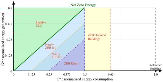Figure 1. Net Zero-Energy Classification from the SHASE (The Society of Heating, Air-Conditioning and Sanitary Engineers of Japan). - Impact of Solar PV System and Energy Storage Capacity: In addition to optimizing the ESS, this study examines the impact of different solar PV system capacities (160, 180, 200, and 250 kW) on the building’s energy management. The SHASE classification system is also applied here to evaluate how varying the PV system size influences the building’s progress through the energy performance zones. The goal is to determine the most effective combination of solar PV capacity and ESS that will maximize energy efficiency and allow the building to achieve Nearly ZEB Level 1 status. By understanding the interaction between solar generation and storage, this research provides insights into how different system configurations can either hinder or advance the building’s journey towards optimal energy performance.