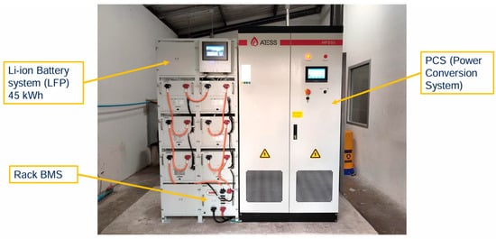 The Energy Research and Development Institute, Chiang Mai University (ERDI-CMU) building, functioning as an office facility of 100 kW size, is equipped with a 160 kW solar photovoltaic (PV) system and a 50 kW–45 kWh energy storage system (ESS) intended to meet its energy demands sustainably as illustrated in Figure 2 and Figure 3.