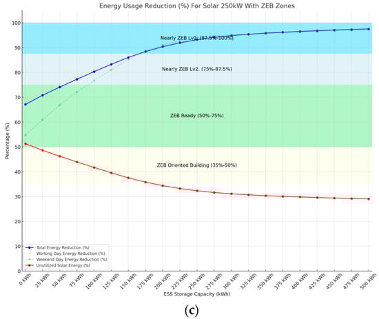 The series of graphs presented show the impact of varying solar PV capacities (180 kW (a), 200 kW (b), and 250 kW (c)) on energy usage reduction and unutilized solar energy percentages, considering different ESS storage capacities ranging from 0 to 500 kWh. The performance is evaluated according to the ZEB zones defined by the SHASE Japan.