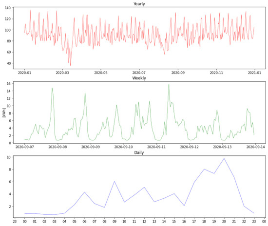 Figure 1 represents the evolution of the electricity consumption for the whole community in kWh over a year, a random week, and a random day, respectively. The curves were obtained by summing up all the houses’ individual profiles.