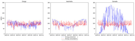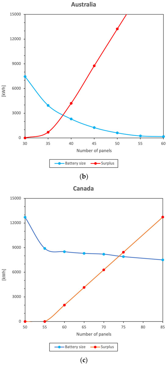 The lowest surplus is observed in Congo, then in Australia, and finally in Canada. It was found that Congo, Australia, and Canada produce, respectively, 4.88%, 6.98%, and 25.06% (of the energy consumption, assumed equal for the three locations) surplus energy. Moreover, that excess could have been lowered with an increase in the battery size, but then the price would be higher.
