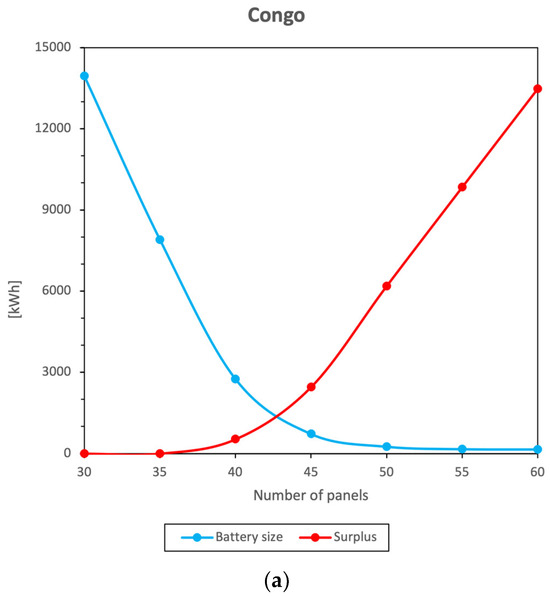 Moreover, as shown in Figure 3, for certain locations it is the surplus that varies more with the number of modules and for others it is the battery size that will have the bigger variation. The slope of each curve shows how big the influence on the number of PV modules is. Moreover, it can be noticed that from a certain number of modules on, the effects become negligible. These results show that the energy surplus is the most influenced metric in Australia and Canada, while it is the battery size in Congo.