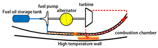A Fuel Vapor Turbine (FVT) system is a combined cooling and power supply system developed based on the supercritical cooling system. The schematic diagram of an FVT is shown in Figure 1. After absorbing the aerodynamic heat, the fuel undergoes pyrolysis to form gas, which then enters the turbine, expands, and generates electricity. Finally, the gas is injected into the combustion chamber for combustion to propel the aircraft. However, the output power of the turbine is closely related to the pyrolysis state of the fuel. When the fuel does not fully pyrolyze, the output power decreases sharply. Conversely, if the temperature continues to rise after pyrolysis, coking may occur, blocking the cooling channel, impairing heat transfer, and greatly increasing the instability of the fuel’s cooling and power cogeneration process [6,7].
