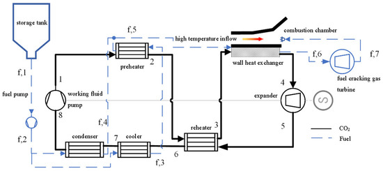 As shown in Figure 2, on the CO2 circulation side, since CO2 has already condensed into a liquid phase before compression (at point 8), a working fluid pump is selected as the compression component. CO2 is pressurized from a liquid-phase state below the critical temperature in the working fluid pump and then enters the supercritical zone (8-1). Next, CO2 passes through the preheater, absorbing heat from the fuel at the cooler’s outlet (1-2), and then through the reheater, absorbing heat from the high-temperature CO2 at the outlet of the expander (2-3). It then enters the wall cooling channel of the scramjet engine, absorbing the high-temperature wall heat load and reaching the highest temperature (3-4). At this stage, CO2 has a strong potential to expand, which it transfers to the expander, converting thermal energy into axial work (4-5) to drive the operation of the pump. The CO2 temperature at the expander’s outlet is relatively high. Direct cooling with fuel would waste high-temperature heat and consume a large portion of the fuel’s heat sink. Therefore, a reheater transfers some of the heat to the low-temperature CO2 on the high-pressure side (5-6). The CO2 is then cooled and condensed by the fuel in the cooler (6-7) and condenser (7-8), completing one working cycle. On the fuel side, the fuel is discharged from the storage tank through the fuel pump (f,1-f,2) and divided into two streams for cooling and condensing CO2 (f,2-f,3 and f,2-f,4), respectively. After absorbing the cooling heat of CO2 in the cooler, the fuel reaches a higher temperature and enters the preheater for further energy coupling with CO2. The fuel coupled with CO2 undergoes combustion chamber wall cooling (f,5-f,6) and expansion work in the turbine (f,6-f,7).