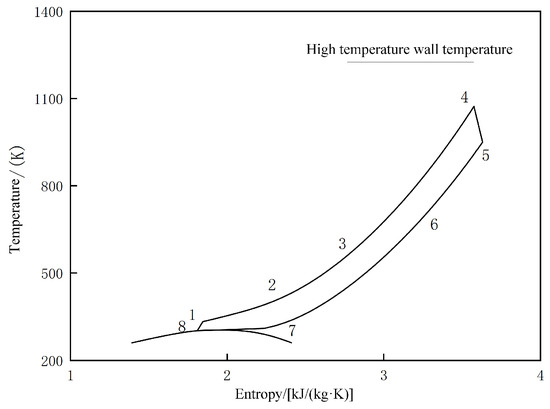 Currently, many researchers are researching the application of the CO2 Brayton cycle for combined cooling and power generation for scramjets. The CO2 Brayton cycle is regarded as a promising technology for future waste heat recovery power generation. CO2 has a low critical temperature (31.1 °C) and exhibits high density and specific heat capacity near the critical point. Cooling CO2 near the critical point for compression can reduce the volume of equipment and the power consumption during compression process. Additionally, CO2 has a high energy density in the supercritical zone, with high work capacity per unit volume and a small expansion ratio. Thus, the CO2 Brayton system can often utilize a single-stage expander, making the system’s structure more compact. Ahn [12] compared and analyzed the size and weight of the CO2 Brayton cycle system. The results showed that, at the same power level, the unit volume of the CO2 Brayton cycle system was only 1/20~1/30 that of the steam Rankine system, and the total weight of the system could also be reduced by about 50%. Compared with the isothermal endothermic process in the ORC, the variable temperature endothermic process of CO2 in the supercritical region matches the heat source better. The above advantages make the CO2 Brayton cycle have a good application prospect in the recovery and utilization of high-temperature heat sources [13].