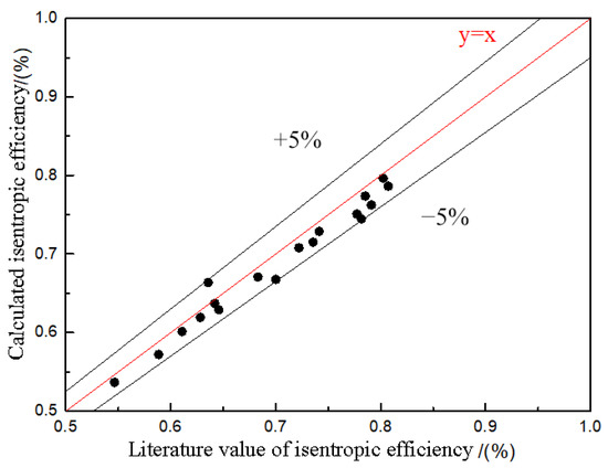 In the genetic algorithm, the optimization objective is to minimize the fitness function value for fitting. The isentropic efficiency is derived from the output power and outlet parameters calculated by the model and then validated against experimental data from the literature to verify the accuracy of the fitted model [26]. The comparison results are presented in Figure 5, showing good consistency between the calculated and experimental values, with errors within ±5%. The results demonstrate that the semi-empirical model, based on the genetic algorithm (GA), can accurately predict the output performance of the scroll expander.