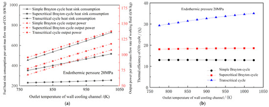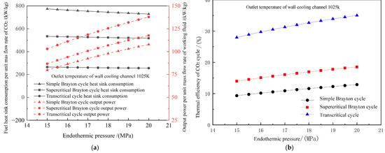 Changes in performance under different endothermic pressures. (a) Fuel heat sink consumption and output power. (b) Thermal efficiency.