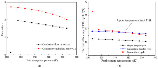 Figure 12 illustrates the changes in CO2 cycle performance when the fuel storage temperature increases from 293 K to 333 K in a high-temperature environment. The additional compression work required by the fuel reduces the thermal efficiency of the CO2 transcritical cycle from 32.8% to 19.2% as the fuel storage temperature rises to 298 K, yet it still outperforms the supercritical and simple Brayton cycles. As the fuel flow in the condenser increases, the compression work on the fuel also rises, consequently lowering the thermal efficiency of the CO2 transcritical cycle until it aligns with the supercritical Brayton cycle at a storage temperature of 318 K. Within the fuel storage temperature range of 298 to 318 K, the thermal efficiency of the CO2 transcritical cycle is up to 6.0% higher than that of the supercritical Brayton cycle, highlighting its advantages within this temperature span.