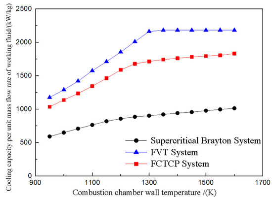 Figure 13 shows the cooling capacity of the FCTCP system as a function of the combustion chamber wall temperature under a unit working medium flow. And it is compared with that of the supercritical Brayton and FVT systems. The FCTCP system exhibits a significantly higher cooling capacity per unit mass flow rate of working fluid flow than that of the supercritical Brayton system. Specifically, the heat load per unit mass flow rate of working fluid of the FCTCP system is 75.4% to 80.8% greater than that of the supercritical Brayton system at various combustion chamber wall temperatures. This improvement can be attributed to two main factors: (1) The endothermic process of the CO2 transcritical cycle and the enhanced preheating process extend the endothermic temperature range of CO2 on the high-pressure side, increasing CO2’s heat-carrying capacity at the same wall temperature. (2) The fuel absorbs less heat in the condenser of the FCTCP system. After condensation, CO2 retains a sufficient low-temperature heat sink, and the heat load absorbed at the cooler side is transferred to CO2 in the preheater. Therefore, after fuel mixing, there are more available heat sinks in the wall cooling channel than the Brayton system, and the cooling capacity of the system is also improved.