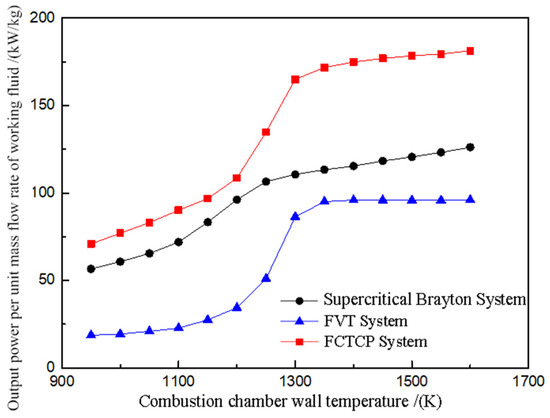 Figure 14 illustrates the variation in output power per unit mass flow rate of working fluid for the three systems at different combustion chamber wall temperatures. As the temperature of the combustion chamber wall increases, the power output of CO2 and fuel also increases due to greater heat absorption from the combustion chamber wall. This leads to an overall rise in the power generation capacity of all three systems. At lower wall temperatures (950–1200 K), the FCTCP system shows a significantly higher increase in output power per unit mass flow rate of working fluid compared to that of the FVT system, with an increase of 110–164%. The results indicate that, under identical conditions, the FCTCP system achieves the highest thermal efficiency compared to that of other systems.