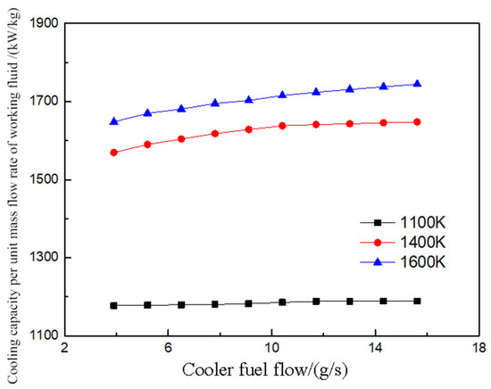 Figure 15 illustrates how the cooling capacity per unit mass flow rate of working fluid in the FCTCP system varies with fuel flow rate in the cooler at different combustion chamber wall temperatures. The calculations are based on wall temperatures of 1100 K, 1400 K, and a maximum of 1600 K. As both the combustion chamber wall temperatures and fuel flow rates increase, the heat transfer efficiency of CO2 and fuel improves, gradually enhancing the cooling capacity per unit mass flow rate of working fluid. At wall temperatures of 1100 K, 1400 K, and 1600 K, the cooling capacity per unit mass flow rate of working fluid of the FCTCP system increases by 1.0%, 4.9%, and 5.8%, respectively, with an increase in fuel flow. These findings indicate that at lower wall temperatures, increasing the fuel flow to the cooler has a modest effect on the system’s cooling capacity, while at higher temperatures, increased fuel flow substantially enhances cooling performance.
