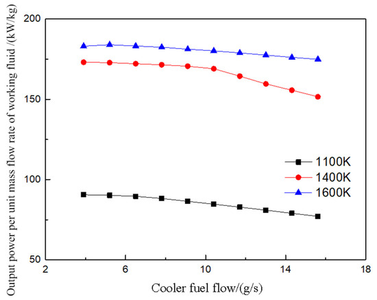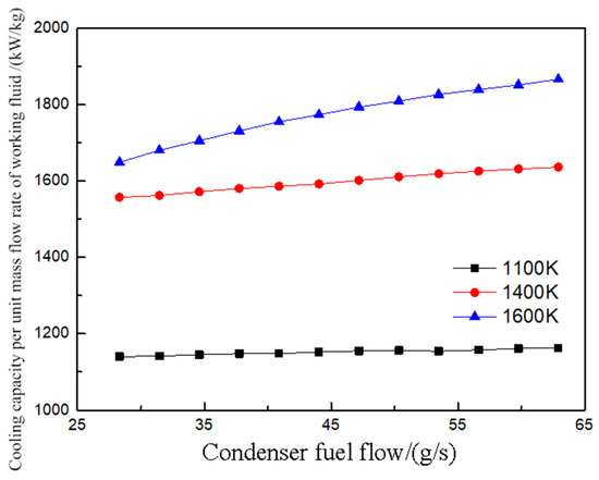 The coupling degree between the fuel in the condenser and the CO2 cycle is relatively low. After condensing CO2, the fuel enters the combustion chamber wall to absorb heat. Consequently, changes in fuel flow rate on the condenser side have a limited impact on the various state points of the CO2 cycle. As shown in Figure 17, the cooling capacity per unit mass flow rate of working fluid in the FCTCP system gradually increases with a rise in fuel flow on the condenser side. Higher combustion chamber wall temperatures improve the heat transfer efficiency of the wall cooling channels, allowing the increased fuel flow to substantially enhance the cooling capacity of the FCTCP system at elevated temperatures. Specifically, at a wall temperature of 1600 K, the cooling capacity per unit mass flow rate of working fluid increased by 13.2% as the fuel flow on the condenser side rose from 28.3 g/s to 62.9 g/s. In contrast, at wall temperatures between 1100 K and 1400 K, the cooling capacity per unit mass flow rate of working fluid increased by only 2.0% to 5.1%. The results indicate that the cooling capacity of the system is significantly enhanced at higher wall temperatures.