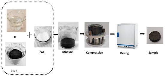 There are two processes for developing composite adsorbents, namely physical mixing or impregnation and the chemical process [39]. The impregnation process was employed to prepare the consolidated composite tablets because of its simplicity and the ability to provide high bulk/interfacial deposit onto the host matrix [37]. The synthesis process involved several steps as shown in Figure 2. First, 1 g of the host material GNP was heated in an oven at 150 °C for 12 h to remove the moisture content and impurities. Second, the ILs were mixed with purified water to form aqueous solutions at 30 wt% concentration. The host matrix from the oven was then immersed into the IL aqueous solution and stirred for 1 h until a homogeneous mix was achieved. The binder solution was prepared by mixing PVA with pure water to utilise various binder concentrations of 2, 5 and 10%. The binder solution was added to the GNP/IL mixture, and the composite were compressed in a shaping mould using predefined weights to provide the required compression. Three different compression pressures of 1, 1.5 and 2 MPa were used to investigate the effect of varying the compression pressure on the composite. The application of these compression pressures was crucial in giving the desired tablet form and ensured that the constituents of the composites (IL and PVA) were not completely driven out during the compression. Finally, the compressed composite samples were dried in an oven at 150 °C for 12 h. The dry sample masses ranged from 0.2 to 0.3 g. The samples’ diameter was 12.7 mm with a thickness of 2.5 mm. It is noteworthy that the 30 wt% IL concentration was regarded as the optimal concentration from previous research that investigated concentrations of 10–40 wt% of powdery GP/IL composites [37].