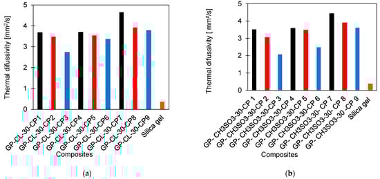 The PVA concentration also influenced the overall thermal diffusivity of the developed composites. The composites GP-CL-30-CP7 and GP-CH3SO3-30-CP 7 showed the highest thermal diffusivities where the lowest PVA concentration of 2% was used, followed by composites with 5% and 10% PVA concentrations. This is attributed to the relatively low heat transfer properties of PVA with a thermal conductivity of 0.31 W m−1 K−1 [42]. This agrees with the findings reported by Younes et al. [20] in their investigation of silica gel composites with polymer binders.