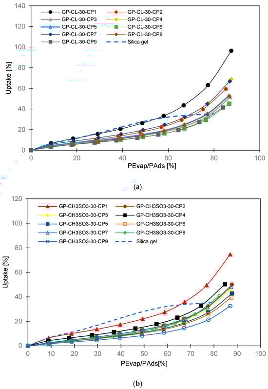 The equilibrium adsorption isotherms for the consolidated composites benchmarked against silica gel baseline adsorbent; (a) GP-CL-30-CPx composites and (b) GP-CH3SO3-30-CPx composites.