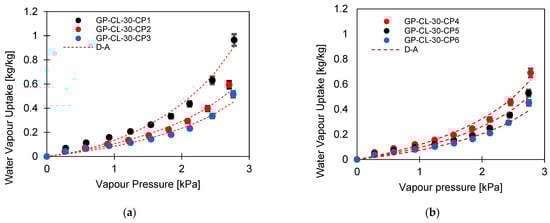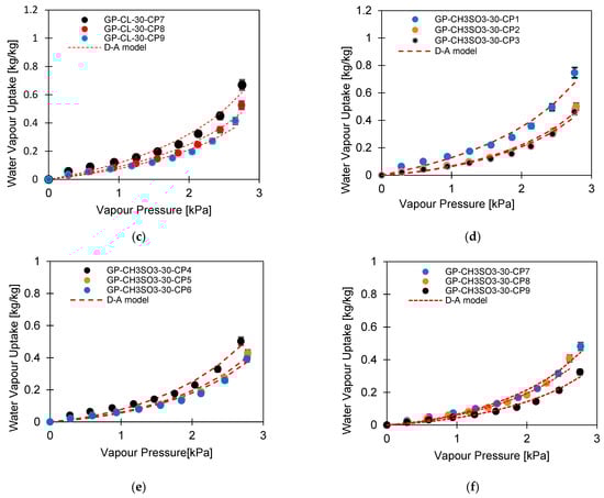 Experimental isotherm of the consolidated composite modelled with the D-A model; (a–c) GP-CL-30-CPx composites and (d–f) GP-CH3SO3-30-CPx composites.