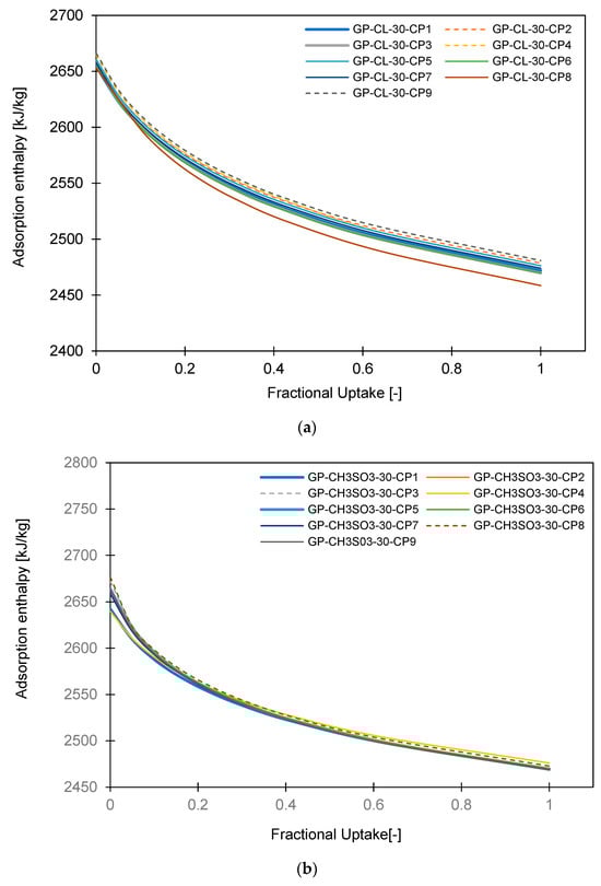 Isosteric heat of adsorption of the developed consolidated composites (a) GP-CL-30-CP1-9 and (b) GP CH3SO3-30-CP1-9.