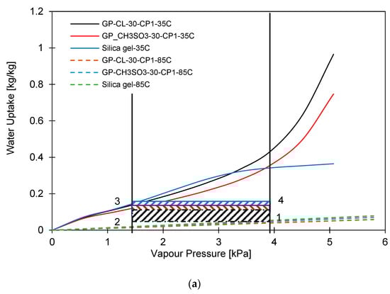 The water uptake potential of the developed composites was determined by performing a material-level cyclic analysis of the experimentally developed isotherms compared to the baseline adsorbent silica gel. Figure 7a,b show the adsorption cooling and desalination cycle (1-2-3-4-1). Two evaporation temperatures at 12 °C and 30 °C, a 35 °C condensation temperature and a 85 °C regeneration temperature were utilised for the assessment. The highest-performing composites with low compressional pressure applied and low PVA concentration, i.e., GP-CL-30-CP1 and GP-CH3SO3-30-CP1, were investigated. At the low evaporator temperature of 12 °C, corresponding to a vapour pressure of 1.4 kPa, the silica gel water uptake performance potential was higher than that of GP-CL-30-CP1 and GP-CH3SO3-30-CP1, in contrast to the performance when the evaporator temperature was 30 °C corresponding to (Pv = 4.2 kPa). At the 12 °C evaporator temperature, the net cyclic water uptake was 0.169 kgw/kgads for SG, 0.157 kgw/kgads for GP-CL-30-CP1 and 0.132 kgw/kgads for GP-CH3SO3-30-CP1. At 3.2 kPa, the GP-CL-30-CP1 isotherm intersects SG while the CH3SO3-30-CP1 isotherm intersects the SG isotherm at 3.8 kPa. As the vapour pressure increases, the net cyclic equilibrium uptake for GP-CL-30-CP1 and CH3SO3-30-CP1 increases by 63% and 51% respectively, as shown in Figure 7b. This showed that higher vapour pressures and evaporation temperatures produce more freshwater at the expense of lowering the cooling temperature.