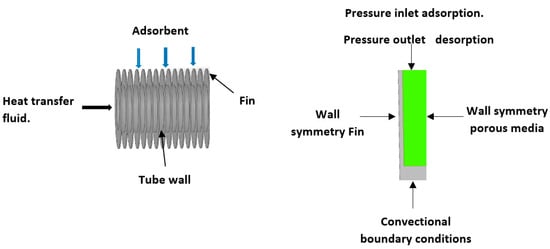 The ANSYS workbench Fluent 2019 R2 was used to simulate the flow in porous media to envisage the heat and mass transfer. The geometry for the simulation was a circular finned tube heat exchanger, where the consolidated adsorbent blocks are assumed to fill the gaps between the fins. The simulated finned tube adsorbent bed, the axisymmetric computational domain and the mesh replicating the simulated geometry are shown in Figure 8. The axisymmetric computational domain was half the space between two fins. The geometry parameters and operating conditions used for the modelling are shown in Table 6 and Table 7.