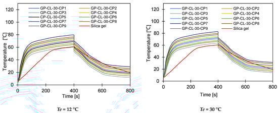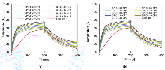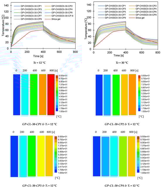 It can be observed that the highest net cyclic temperature rise was 65% for the GP-CL-30-CP1-based system compared to 51% for SG. The same trend was observed for the 800 s cycle, as utilising GP-CL-30-CP1 led to a net cyclic temperature rise of 75% compared to 58% for SG. The dynamic temperature profile of the system utilising the consolidated composites showed a steep temperature rise during the first 100 s for both the 400 s and 800 s, showing their ability to reach the desired temperature faster, hence improving cyclic performance.
