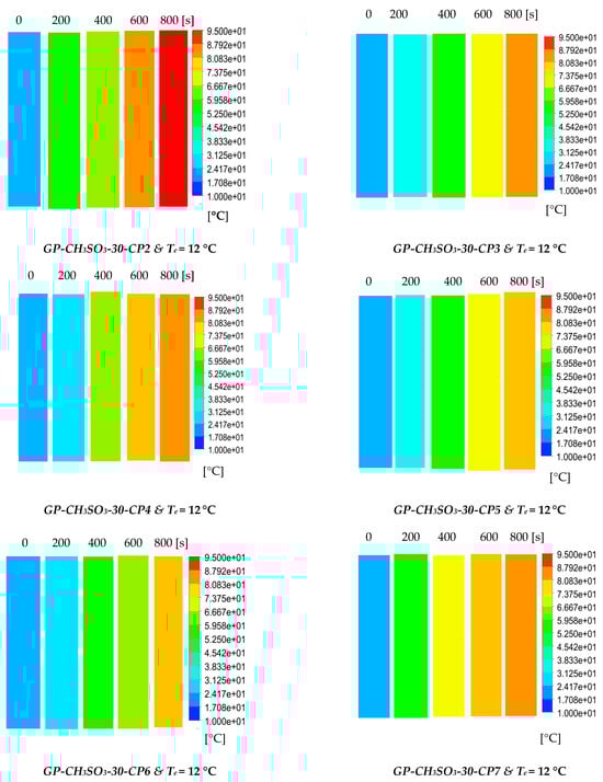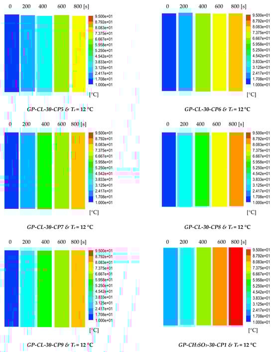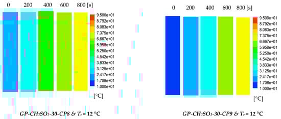 Dynamic temperature profiles and contour colour maps at different flow times for GP-CL-30-CP1-9 and GP-CH3SO3-30-CP1-9.