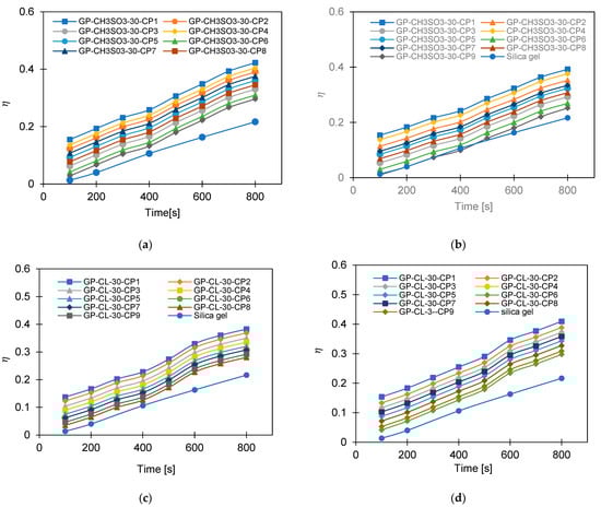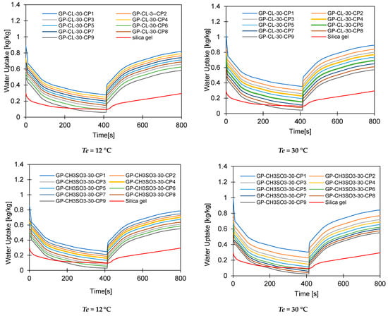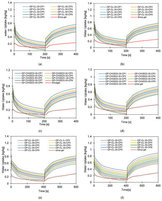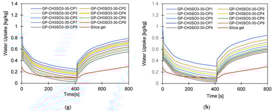 Dynamic water uptake profiles for GP-CL-30 CP1 to CP9 and-CH3SO3-30 CP1 to CP9 at (a) Tev = 12 °C temperature tcycle = 400 s; (b) Tev = 30 °C temperature tcycle = 400 s; (c) Tev = 12 °C temperature tcycle = 400 s (d) Tev = 30 °C temperature tcycle = 400 s; (e) Tev = 12 °C temperature tcycle = 800 s, (f) Tev = 30 °C temperature tcycle = 800 s; (g) Tev = 12 °C temperature tcycle = 800 s; and (h) Tev = 30 °C temperature tcycle = 800 s.