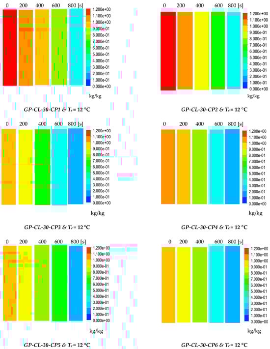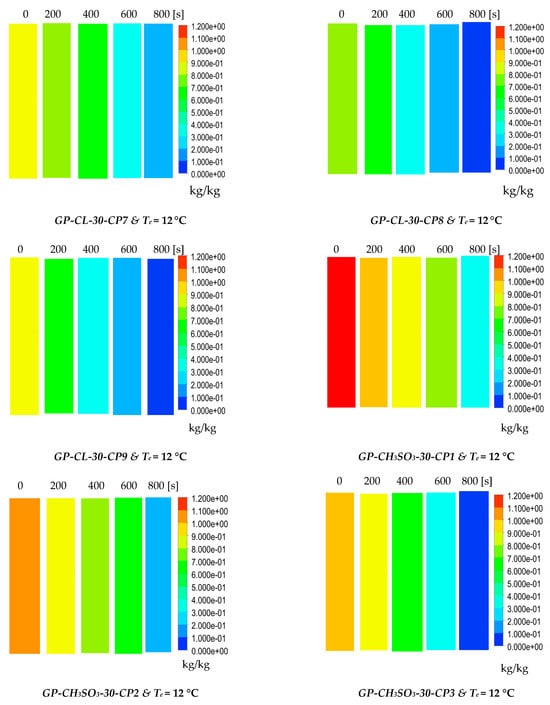 The water uptake potential of the consolidated composites was further investigated to understand the combined impact of their thermal and adsorption characteristics at the component level compared to the baseline adsorbent SG. A 2D multi-physics model reported in a previous study by Banda et al. [38] was employed for this analysis. Computational dynamic modelling is crucial for component- and system-level investigation [56]. The simulation was performed for 400 s and 800 s cycle times, including a switching time of 30 s. The same simulation process used is reported in the previous publication by Banda et al. [38].