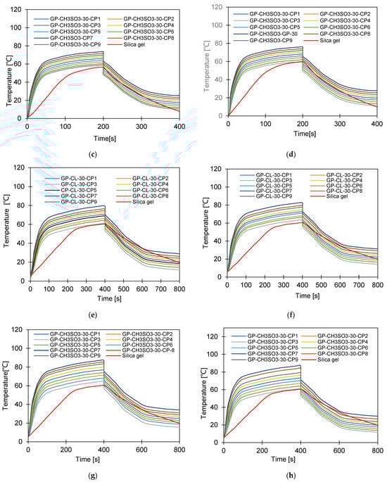Dynamic temperature profiles for GP-CL-30 CP1to CP9 at (a) Tev = 12 °C temperature tcycle = 400 s; (b) Tev = 30 °C temperature tcycle = 400 s; (c) Tev = 12 °C temperature tcycle = 400 s; (d) Tev = 30 °C temperature tcycle = 400 s. (e) Tev = 12 °C temperature tcycle = 800 s; (f) Tev = 30 °C temperature tcycle = 800 s. and (g) Tev = 12 °C temperature tcycle = 800 s; (h) Tev = 30 °C temperature tcycle = 800 s.