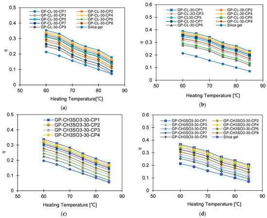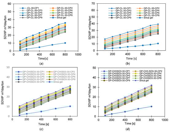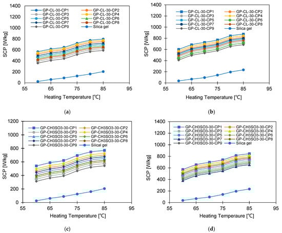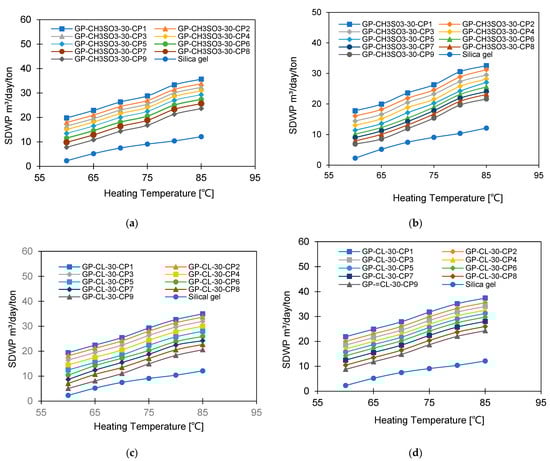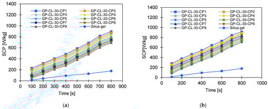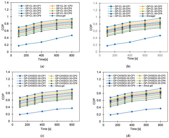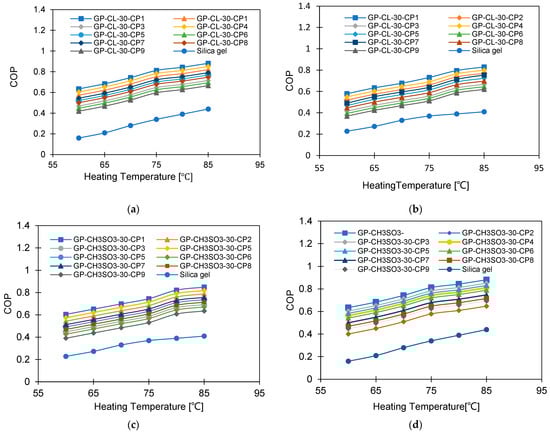 Comparison of GP-CL-30-CP1, GP-CH3SO3-30 CP1 and SG at 35 °C, condensation and 85 °C, regeneration temperatures for (a) 12 °C and (b) 30 °C evaporation temperatures.