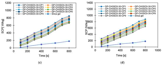 The effect of changing cycle time on SCP for GP-CL-30 CP1-CP9 at (a) Tev = 12°C and (b) Tev = 30 °C and GP-CH3SO3-30 CP1-CP9 and SG time at (c) Tev = 12 °C and (d) Tev = 30 °C.