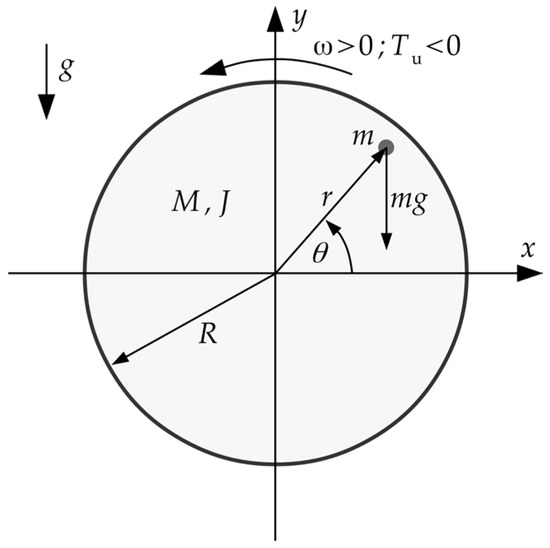 For the purposes of this publication, a simplified unbalance model was adopted, which focusses on taking into account the influence of the weight of the unbalance mass on the creation of the moment of force coming from the force of gravity [39]. This approach does not take into account the centrifugal force because the control system on which the method was developed does not have any information about the current value of this force. The idea is presented in Figure 1, which shows the action of the gravitational force mg on an unbalanced mass m, located at a distance r from the axis of rotation of a cylinder with mass M, moment of inertia J, and radius R. It was assumed that this cylinder rotates with constant angular velocity ω relative to the stationary x-y coordinate system. The acceleration due to gravity is set in the vertical direction, parallel to the y axis. The value of the torque acting on the mass m can be expressed by Formula (1), written as follows: